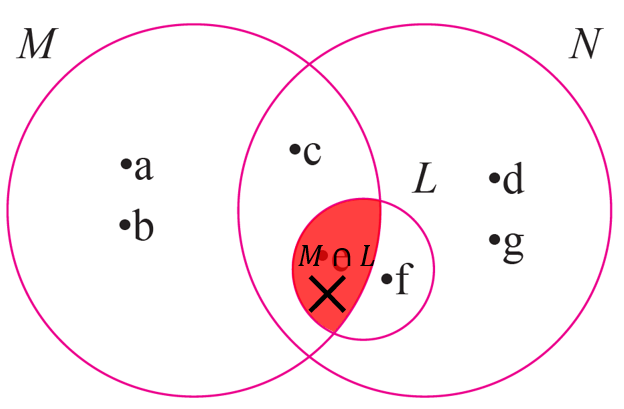 Gambar rajah Venn menunjukkan set L, set M, set N dan set semesta, ξ = {a, b, c, d, e, f, g}.