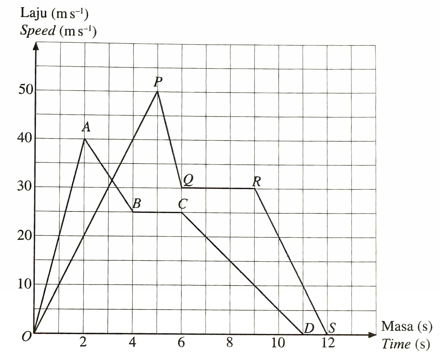 Rajah 6 menunjukkan graf OABCD dan graf OPQRS. Graf OABCD mewakili gerakan zarah X dan graf OPQRS mewakili gerakan zarah Y.