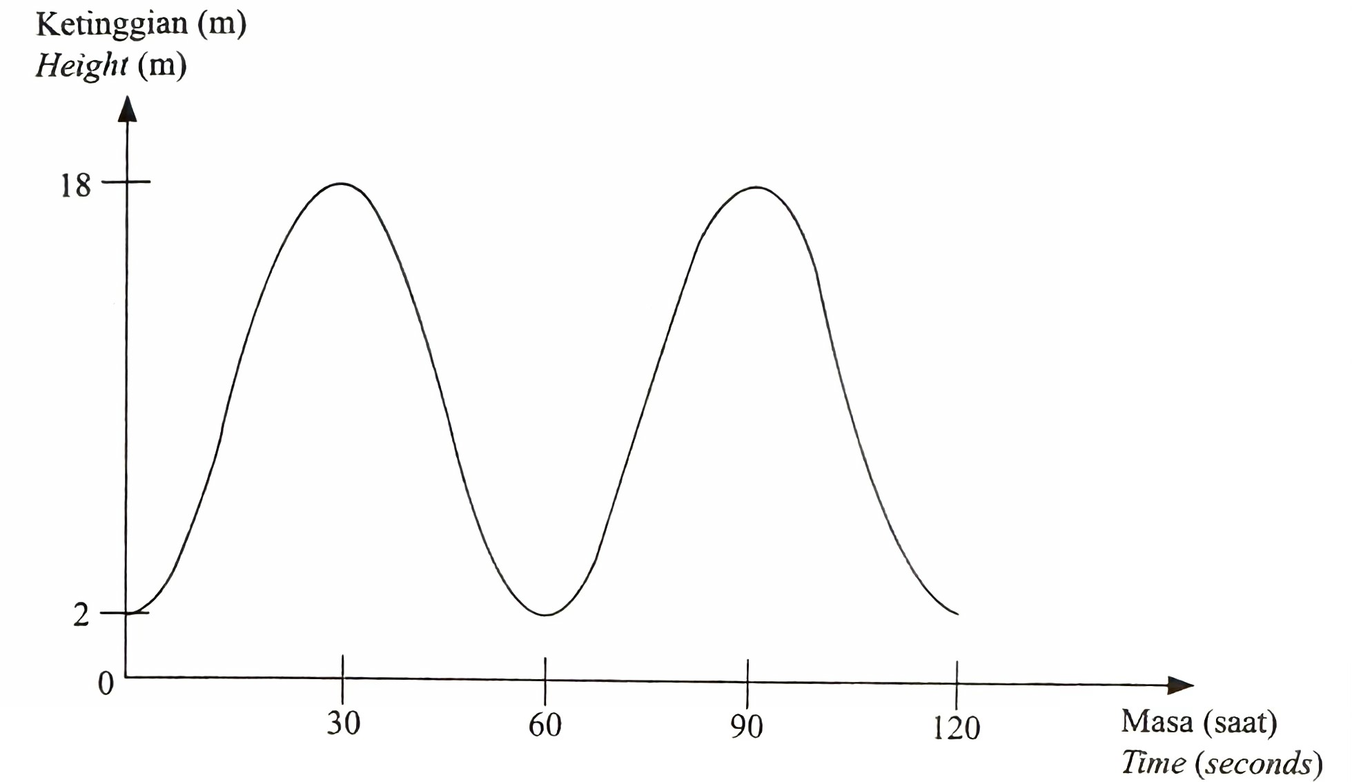 Azlan menaiki sebuah roda Ferris. Rajah 7 menunjukkan sebuah graf fungsi trigonometri yang mewakili ketinggian tempat duduknya di atas roda Ferris.